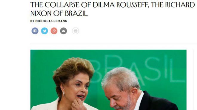 "Richard Nixon foi reeleito de maneira esmagadora em novembro de 1972 e renunciou em agosto de 1974. Dilma Rousseff, presidente do Brasil, parece estar seguindo o mesmo caminho: reeleita (não de maneira esmagadora) em outubro de 2014, ela corre tanto perigo um ano e meio depois que não parece que vai conseguir finalizar seu mandato", afirma a revista.